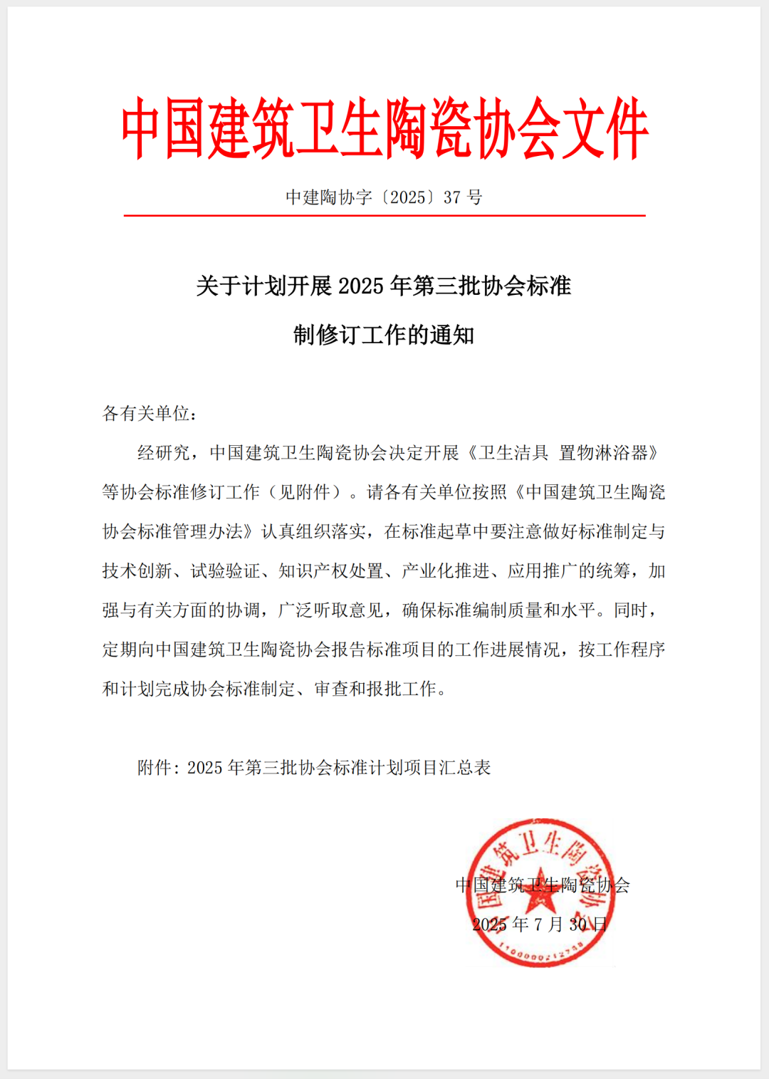 关于计划开展2025年第三批协会标准制修订工作的通知