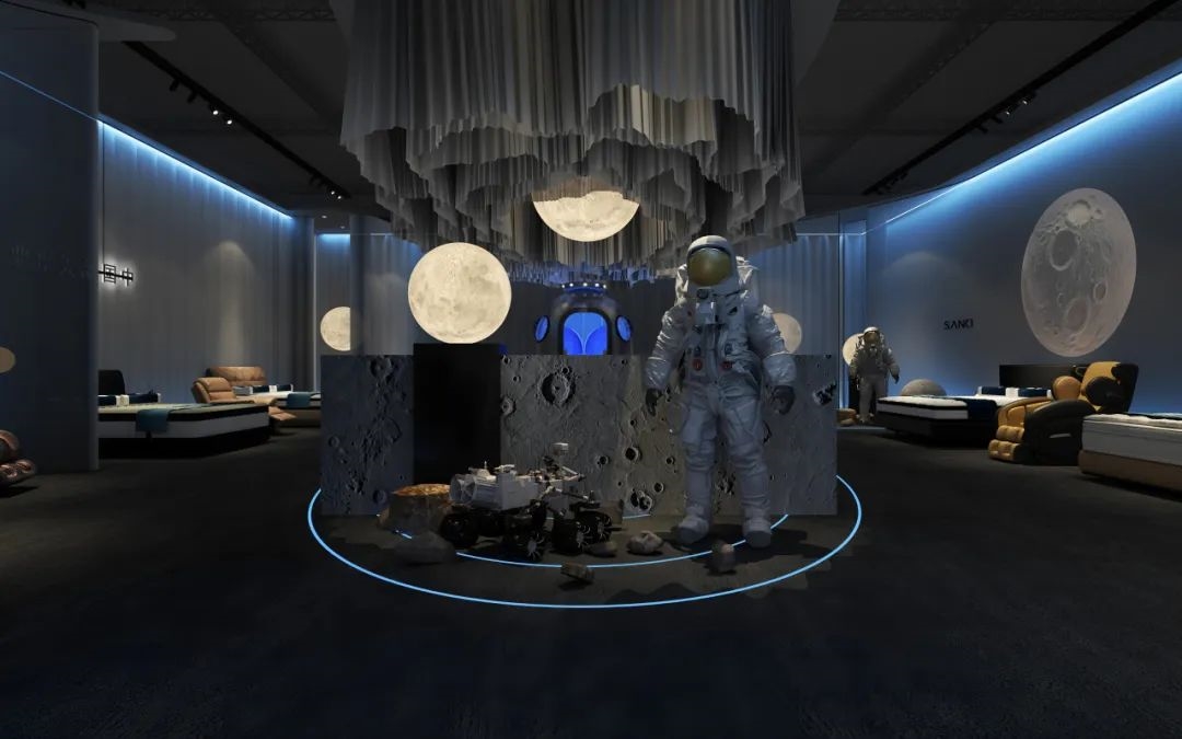 尚驰品牌连续多年荣获得床垫/软床十大品牌,拥有国家专利100多项,作为中国航天事业合作伙伴,本次展会,以航天视野装饰,深邃的太空元素和精致的智能的睡眠寝具,对尚驰“全球定制睡眠领导品牌”做出强有力的诠释,极富未来科技感。