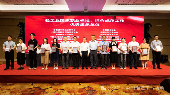 大会对在轻工职业能力评价工作中表现突出的单位和个人进行了表彰。中国陶瓷工业协会荣获“2024 年度轻工职业能力评价千人卓越单位”“轻工业国家职业标准、评价规范工作优秀组织单位”称号;中陶协培训部副主任肖艳娜荣获“2024 年度轻工行业职业能力评价先进个人”称号;中国陶瓷工业协会瓷砖粘贴技术专业委员会胡雪艳、轻工业人才交流中心无锡分中心吕海涛荣获优秀督导员;河南省陶瓷玻璃行业管理协会王耀婷、南昌高新技术产业开发区云帆职业技能培训学校有限公司范俊强荣获优秀考评员。在全国轻工行业国家职业标准工作优秀个人方面,无锡工艺职业技术学院陆小荣教授,河南省陶瓷玻璃行业管理协会杨德林会长获得荣誉;在全国轻工行业评价规范工作优秀个人方面,中国陶瓷工业协会瓷砖粘贴技术专业委员会胡雪艳、东方雨虹民用建材有限责任公司高占强获此称号。
