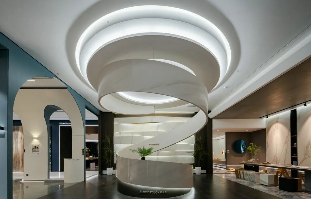 产业升级的本质是前瞻性响应市场需求。 2008年瓷质全抛釉产品快速发展,马可波罗瓷砖凭借技术积累完成迭代,在行业浪潮中持续领跑。近年来,面对消费升级与绿色建筑理念普及,企业加大研发力度,推出三大核心科技:全球首创 3mm SPT 智能抛光亮面岩板,以超薄质感突破传统陶瓷物理局限;马可波罗曲面岩板,解决异形空间装饰难题;AI 随机无限连纹技术,通过数字技术实现纹理自然延续,满足高端装修美学需求。这些创新产品呼应了市场对高品质、个性化、绿色化产品的需求,将中国建筑陶瓷技术推向世界前沿。