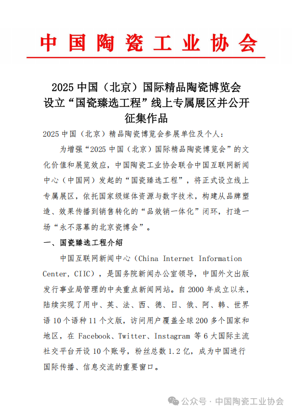 为进一步拓宽陶瓷企业销售渠道,提升展会文化价值与品牌效应,中国陶瓷工业协会将在“2025中国(北京)国际精品陶瓷博览会”期间,联合中国互联网新闻中心(中国网)共同启动“国瓷臻选工程”,并设立线上专属展区。该工程旨在依托国家级媒体传播力与数字技术,构建品牌塑造、效果传播到销售转化的完整闭环,打造“永不落幕的北京瓷博会”。现面向全国陶瓷艺术家、工艺美术师、产瓷区及企业公开征集优秀作品。通知如下: