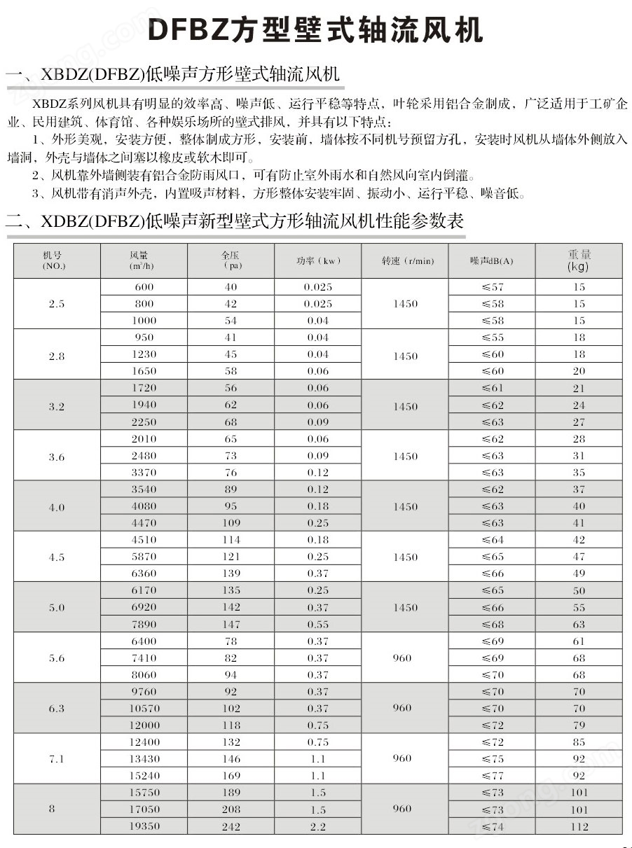 一:XBDZ(DFBZ)低噪声方形壁式轴流风机
