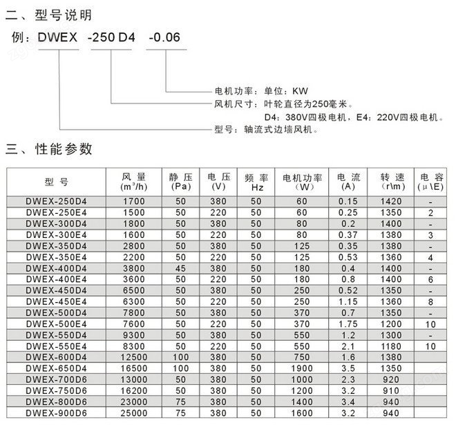 DWEX(WEX)边墙风机采用的前掠型叶片、低噪音的外转子或内转子风机专用电机直联传动,方形外壳设计可以方便地安装在混凝土墙、砖墙或轻钢压型墙板上,方形防雨罩结构牢固,外形美观。具有噪声低、风量大、运行可靠、性能参数范围广、安装简便等特点,广泛应用于厂矿企业车间和民用、商用建筑工程的边墙壁式通风换气。根据输送介质的要求,可制成防腐、防爆型。