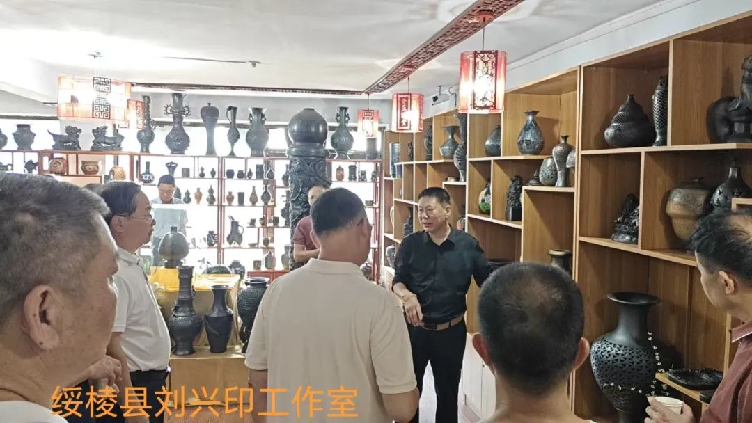 26日上午,调研团抵达绥棱县,文旅局局长田刚接待并陪同走访刘兴印灵透黑陶有限公司、李少森黑陶工作室等。刘兴印作品胎体薄如蝉翼,能映出木纹,尽显黑陶“薄如纸”的极致工艺;李少森黑陶显手工拉坯古法厚重,与德化白瓷的莹润通透相映成趣,形成“黑与白”的鲜明艺术对话。