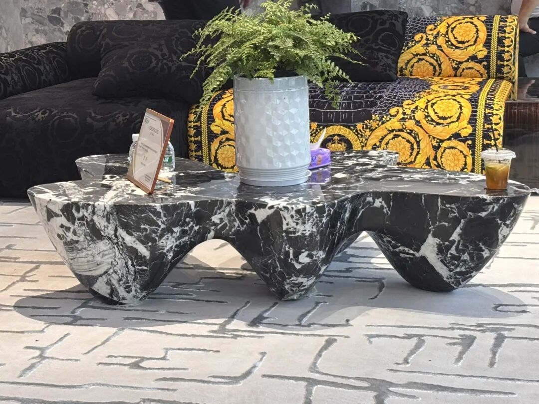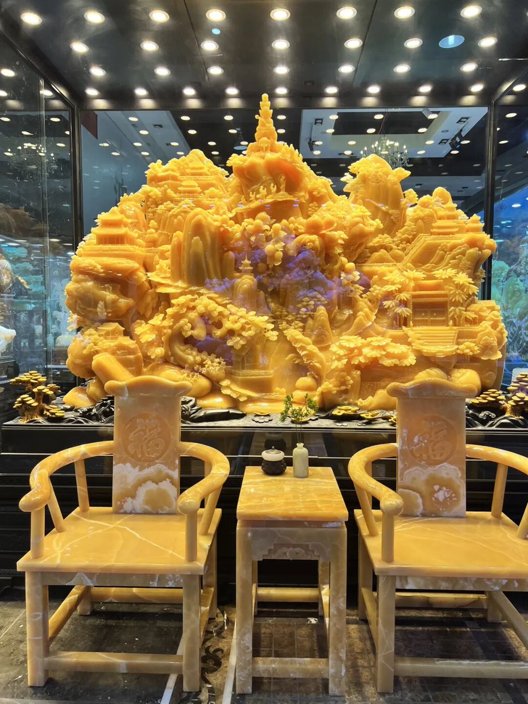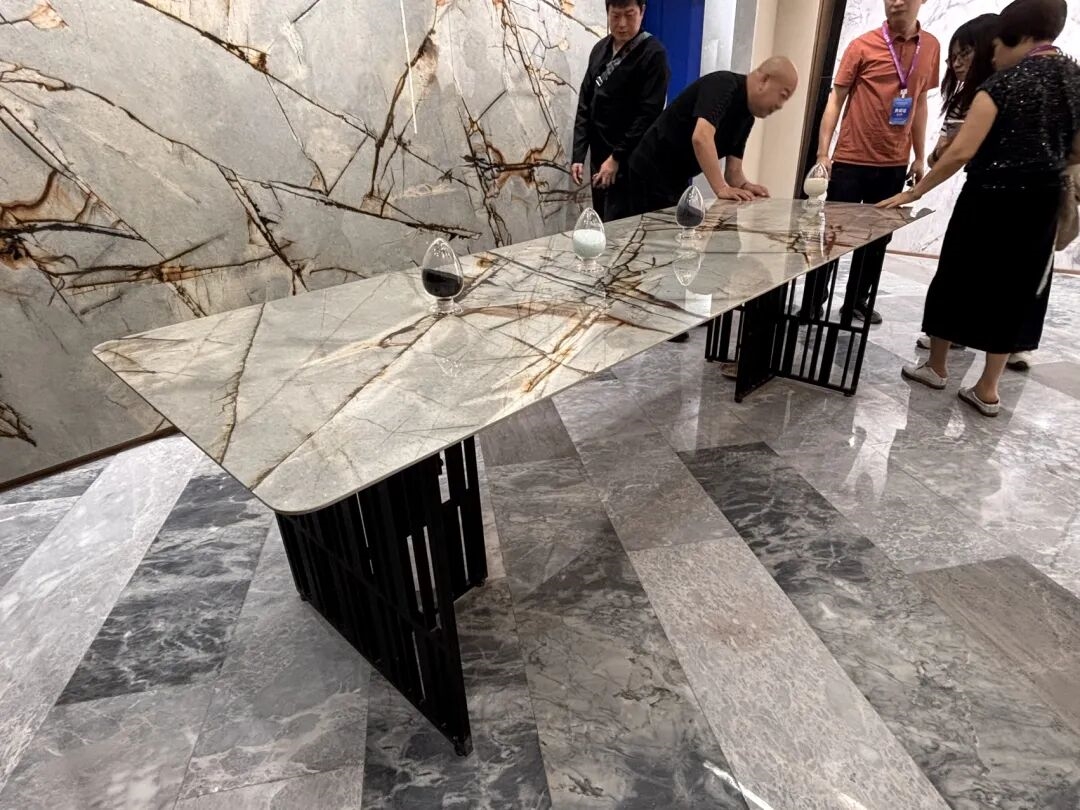 第二站,考察团来到云浮石材博览交易中心。在工作人员的引导下,大家参观了主题展区与特色石材展品。这里汇聚了来自各地的优质石材,从传统的大理石、花岗岩,到新型的复合石材,应有尽有。讲解员深入解读了石材行业的最新趋势,如绿色环保石材的研发与应用,以及石材在室内外装饰、家具制造等领域的拓展,让考察团成员对石材产业的未来发展有了更清晰的认识。考察团还参观了我们协会优秀的会员企业——创美石材有限公司,见识到了奢石在不同家具上的精美应用。