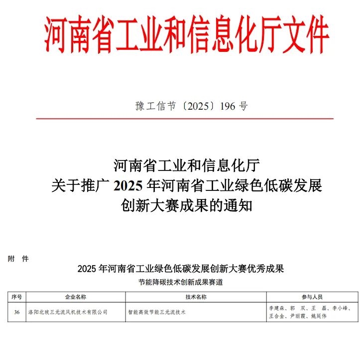 近日,河南省工业和信息化厅正式公示2025年河南省工业绿色低碳发展创新大赛获奖名单,洛阳北玻三元流风机技术有限公司凭借自主研发的 “智能高效节能三元流技术” ,在竞争激烈的节能降碳技术创新成果赛道中脱颖而出,成功斩获优秀奖,为企业绿色创新之路再添里程碑。