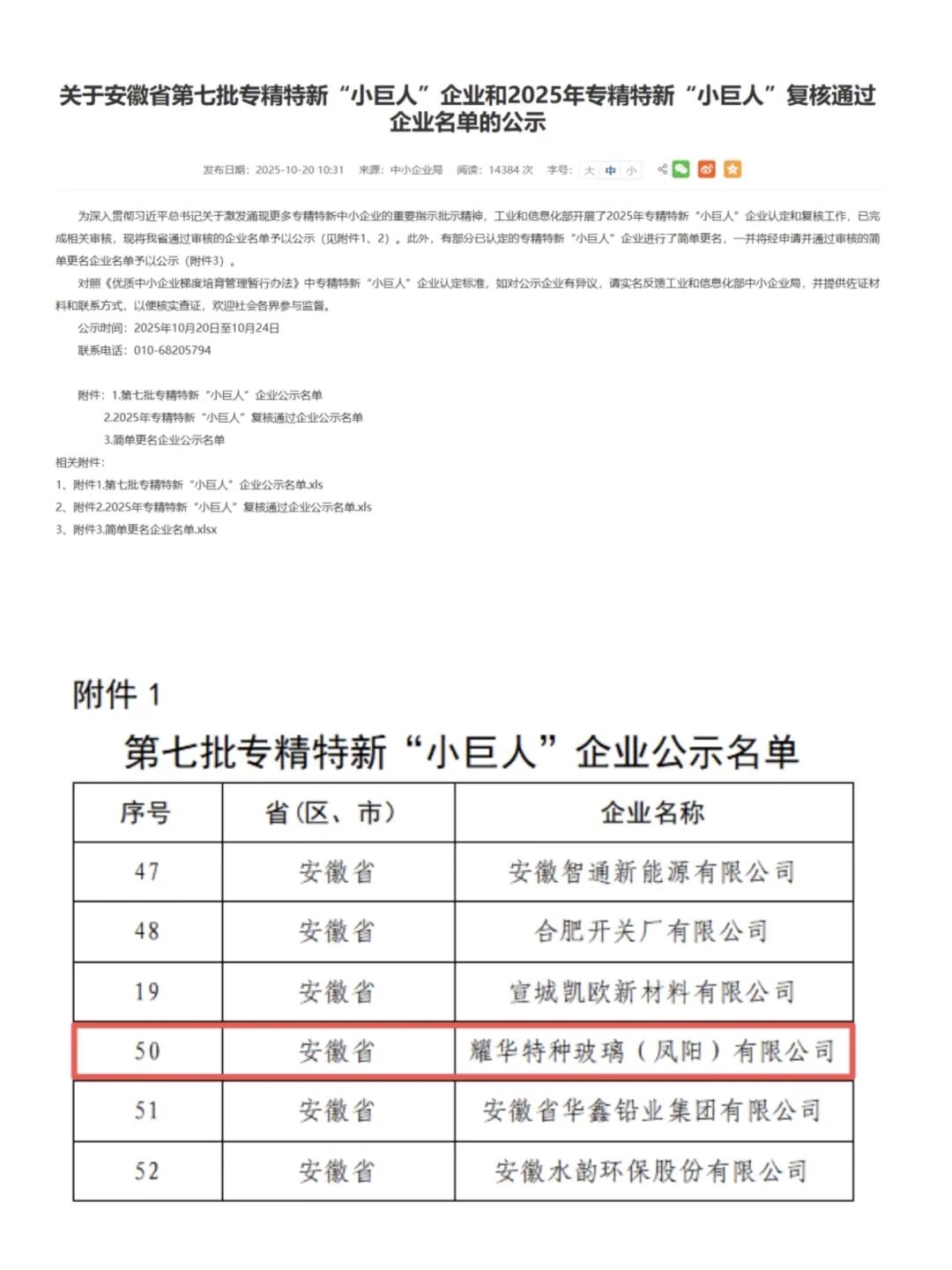 2025年10月20日,工信部正式发布第七批国家级专精特新“小巨人”企业名单,耀华凤阳凭借在专业技术、创新能力、市场地位及质量管理等方面的卓越表现成功入选,再度获得国家级认可。