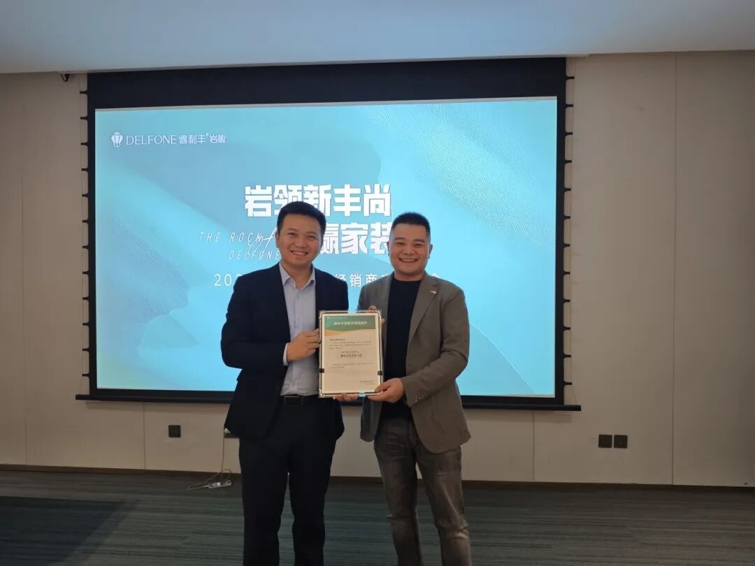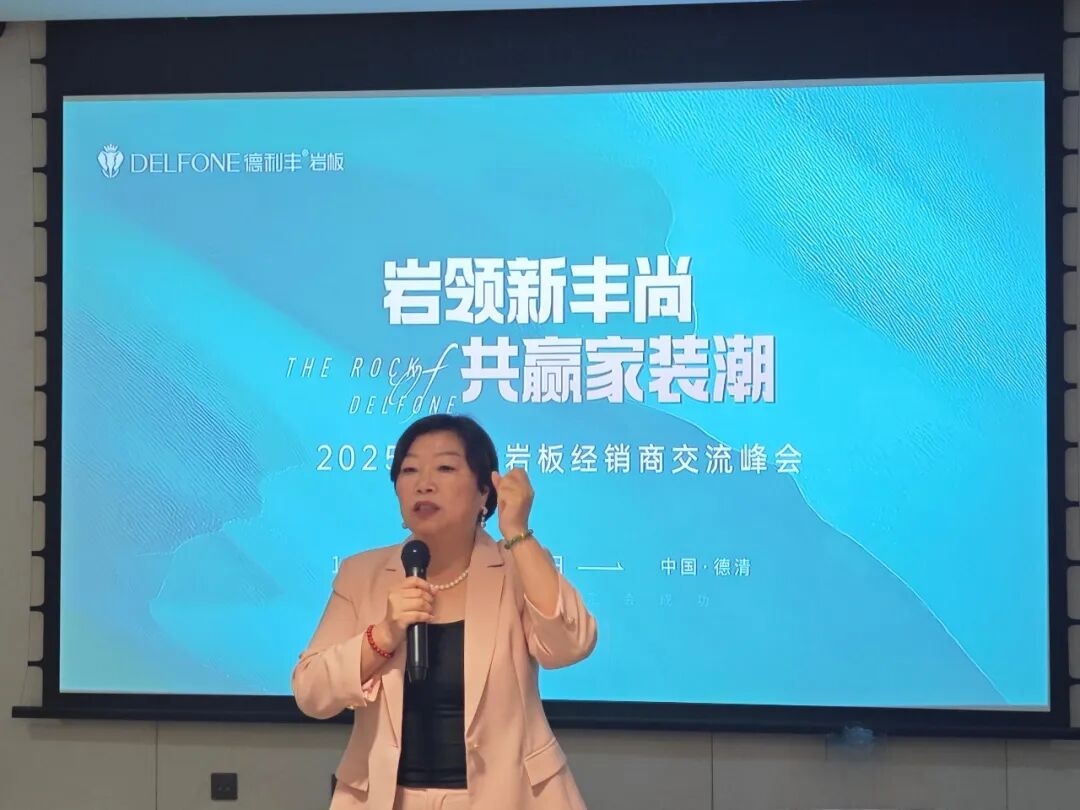 峰会最后,德利丰企业副总裁张代兰女士发表总结致辞。她表示,此次专程来到德清,就是为了近距离倾听终端伙伴的真实声音,感知市场一线的脉搏,现场看到众多经销商伙伴在终端市场的出色表现,倍感温暖与力量。张总强调,德利丰始终以生产研发为根基,多年来深耕岩板领域,凭借技术创新与品质坚守树立了行业标杆。未来,企业将继续聚焦产品力提升,不断迭代升级,为经销商伙伴提供更具市场竞争力的产品矩阵,筑牢终端盈利的核心底气。