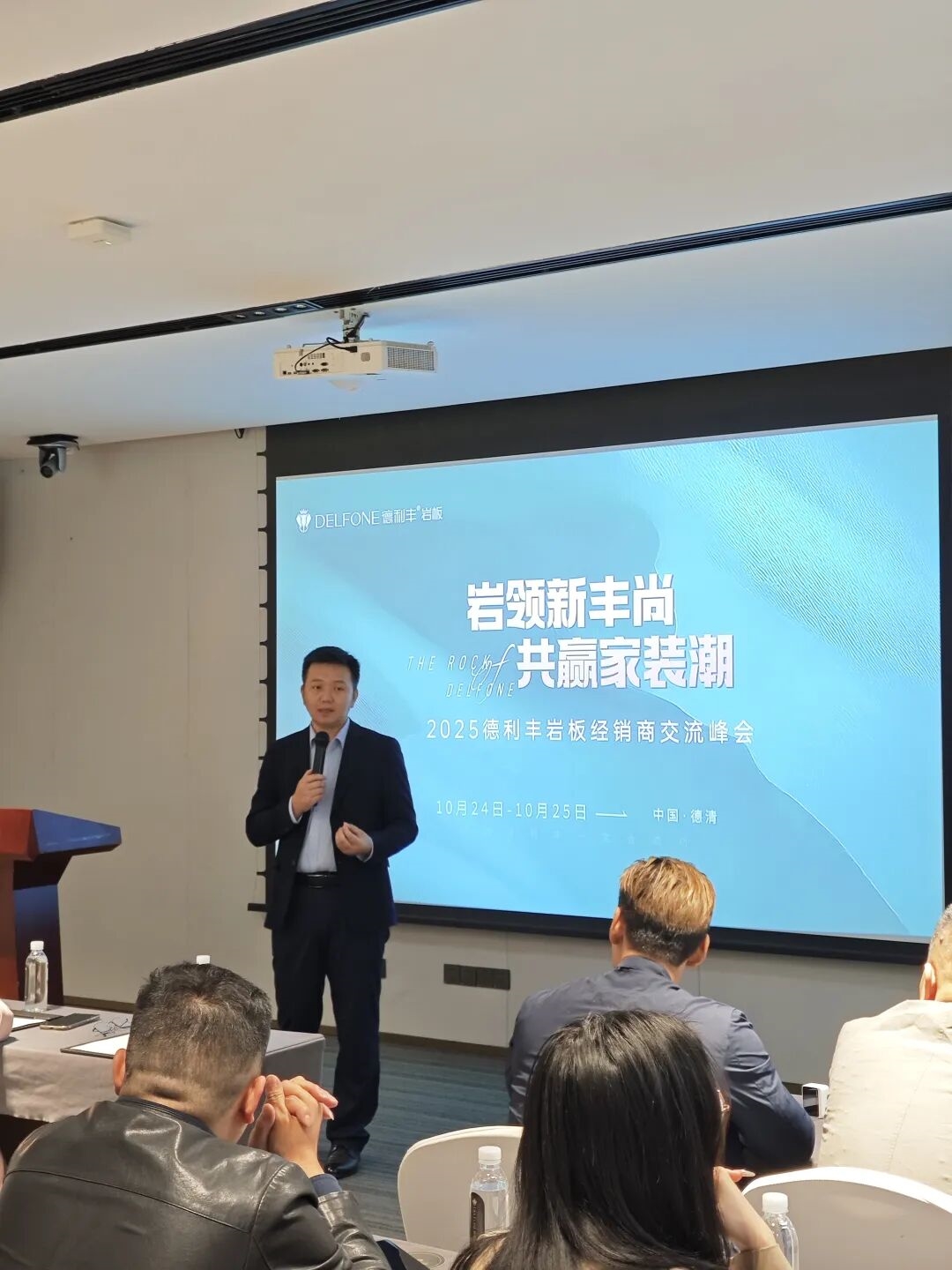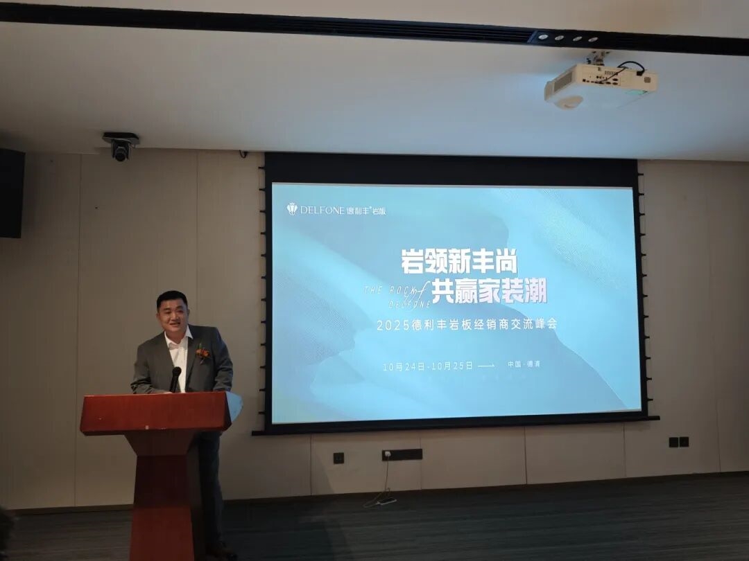峰会伊始,德利丰岩板副总经理赵帆发表致辞。他直面当前行业挑战,坦言市场环境复杂下,众多品牌及终端商家面临转型压力与经营困境。随后,赵总回顾德利丰多年在挑战中不断突破的发展历程,并强调刚推出的秋季新品正是品牌硬核实力的最佳印证,彰显全行业领先的产品竞争力。他呼吁经销商伙伴紧跟总部步伐,凝心聚力共创辉煌;同时期待通过本次交流会,让大家更深层次了解德利丰的品牌实力与发展潜力,未来携手共进,共创佳绩。