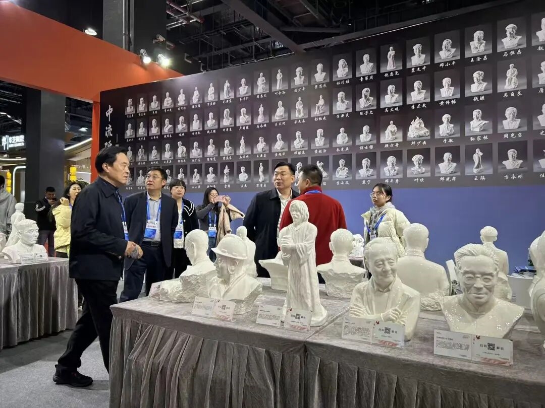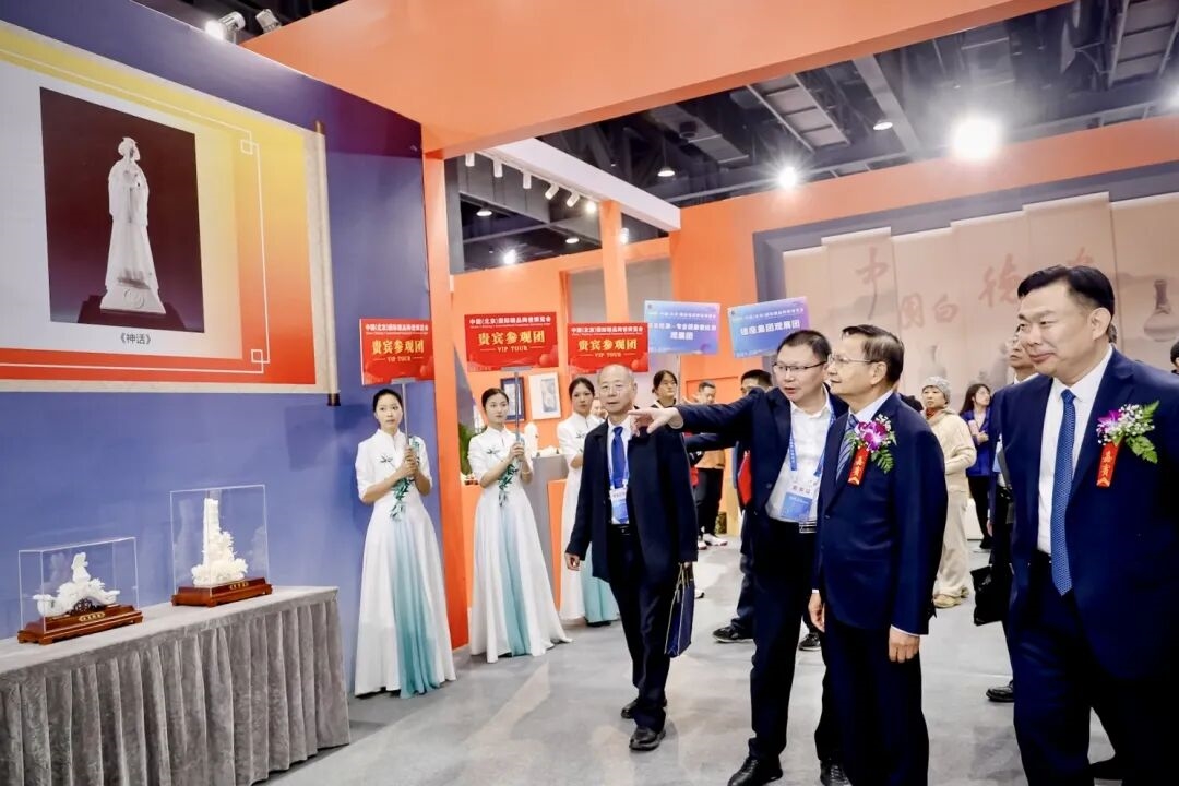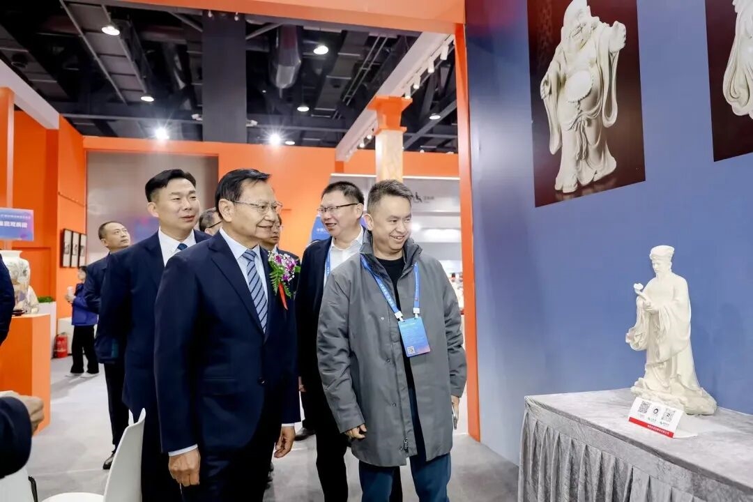 中国轻工业联合会党委书记、会长张崇和,中国陶瓷工业协会理事长刘挺等一行来到中国白•德化瓷展厅,实地参观指导闽瓷展示工作,对福建陶瓷的工艺传承与产业创新成果给予高度关注。在展厅内,领导一行沿展区有序参观,先后驻足于德化白瓷经典陈设瓷、现代日用陶瓷及陶瓷文创产品前,仔细察看器物的造型设计、釉色质感与工艺细节。